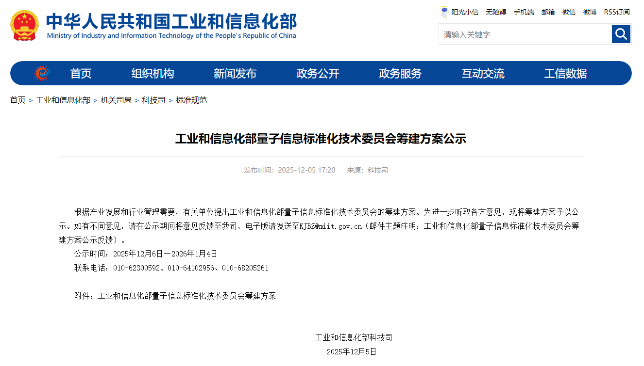 上证报中国证券网讯 工业和信息化部科技司12月5日公示工业和信息化部量子信息标准化技术委员会筹建方案。